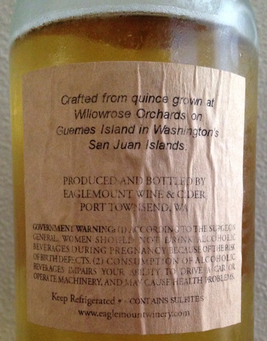 Additional Info from Trudy Davis, the vintner at Eaglemount, in Response to My Request: Our winery is located on an 1883 Homestead that has the original apple trees. These were the foundation for our first ciders. All of our apples come from a 20 mile radius here on the Olympic Peninsula. The quince come from a certified organic orchard in the San Juan Islands. Quince is a hard to describe flavor; honeysuckle, tropical fruit, and grapefruit are some descriptors.