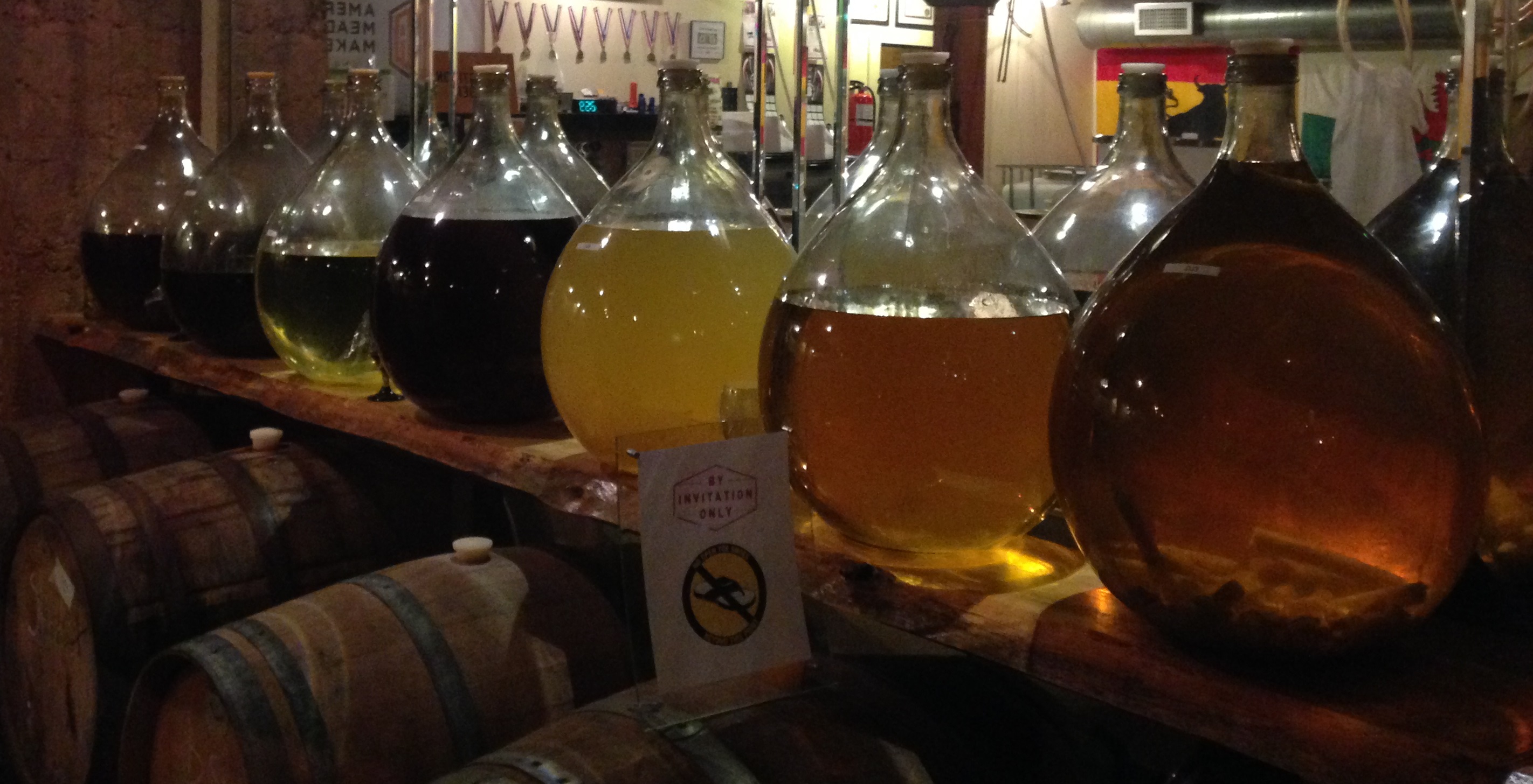 <small batch mead in their workshop, including a few cherry trials on the left,