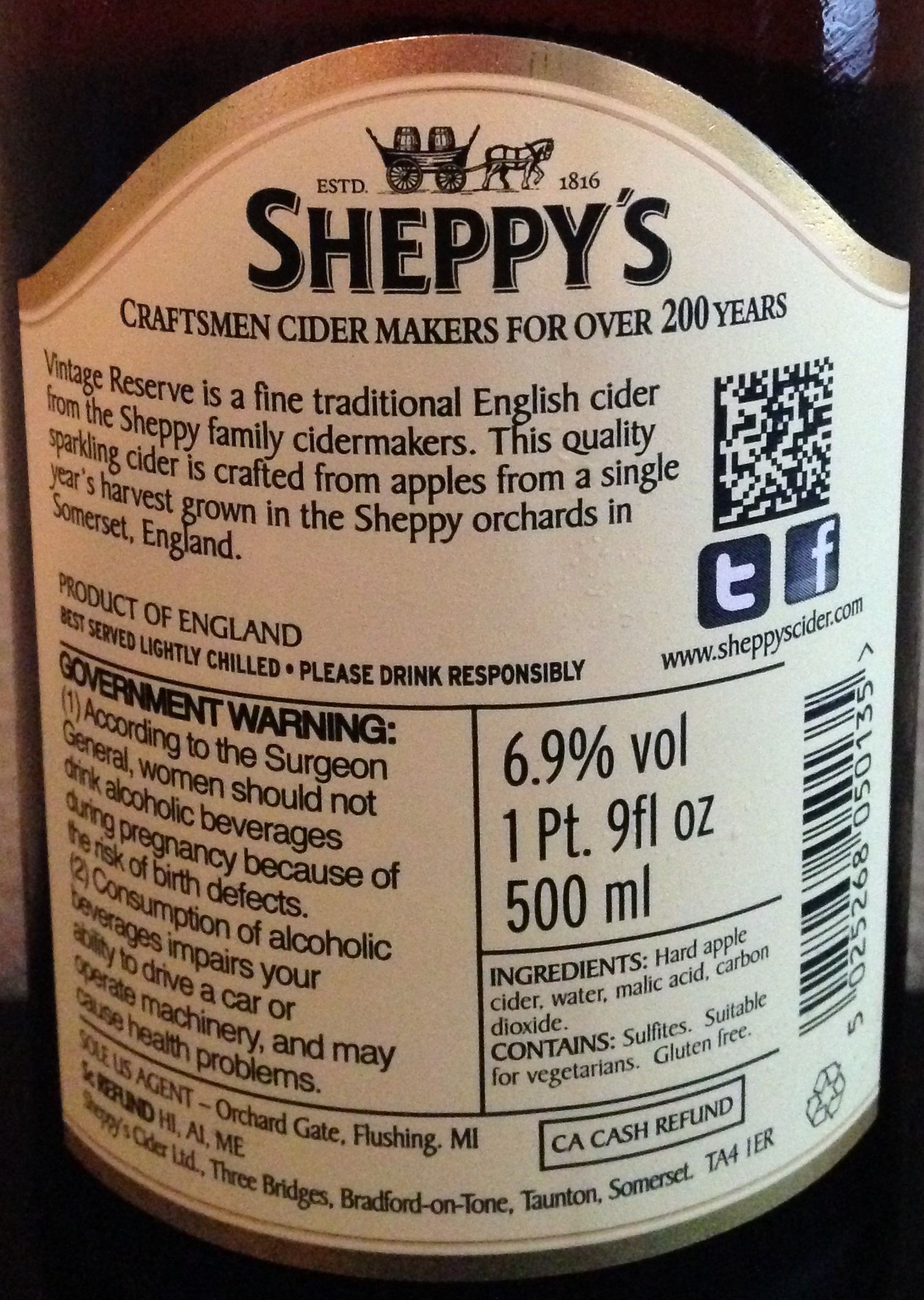 Cider Description:  Vintage Reserve is a fine traditional English cider from the Sheppy family cidermakers.  This quality sparkling cider is crafted from apples from a single year’s harvest grown in the Sheppy orchards in Somerset, England.